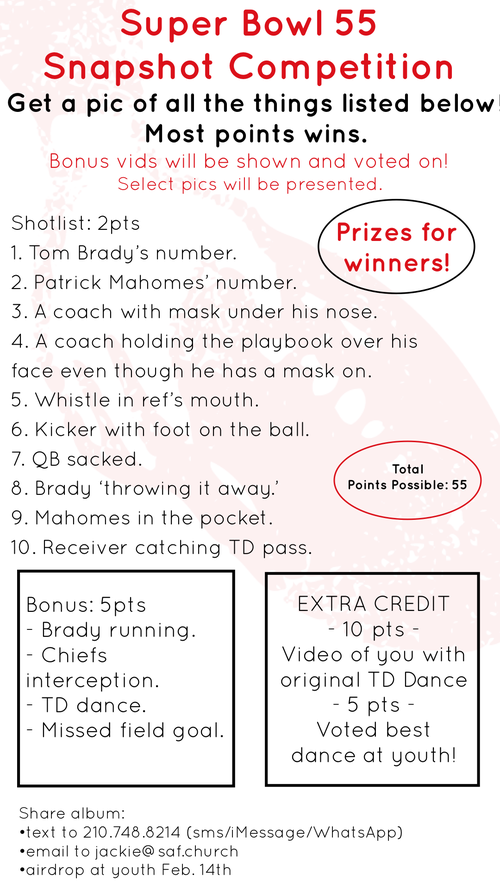 At youth group we will tally the winners, show the videos and a selection of the snapshots submitted. Prizes will be awarded, and you never know what extra special things might be given out!